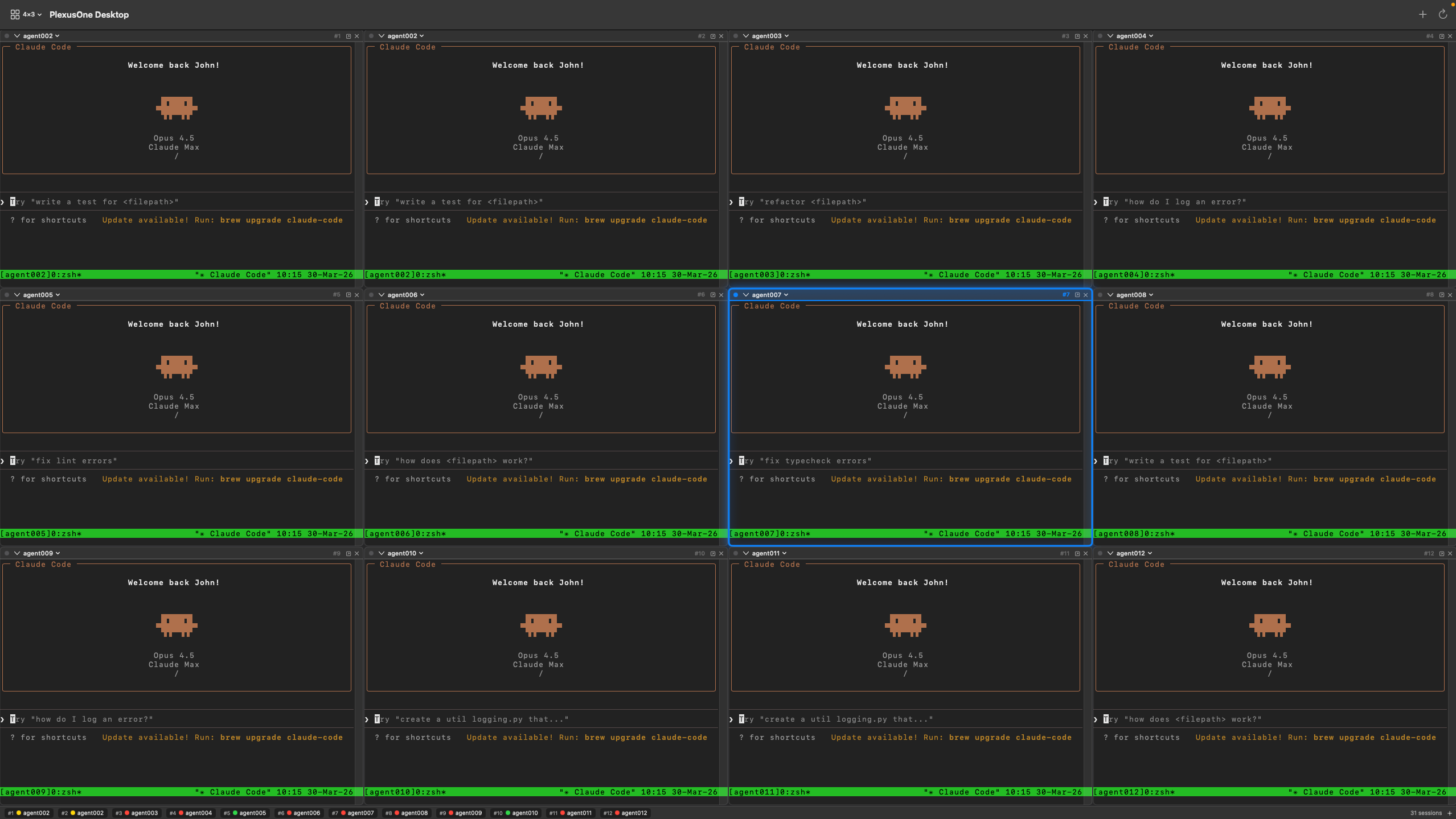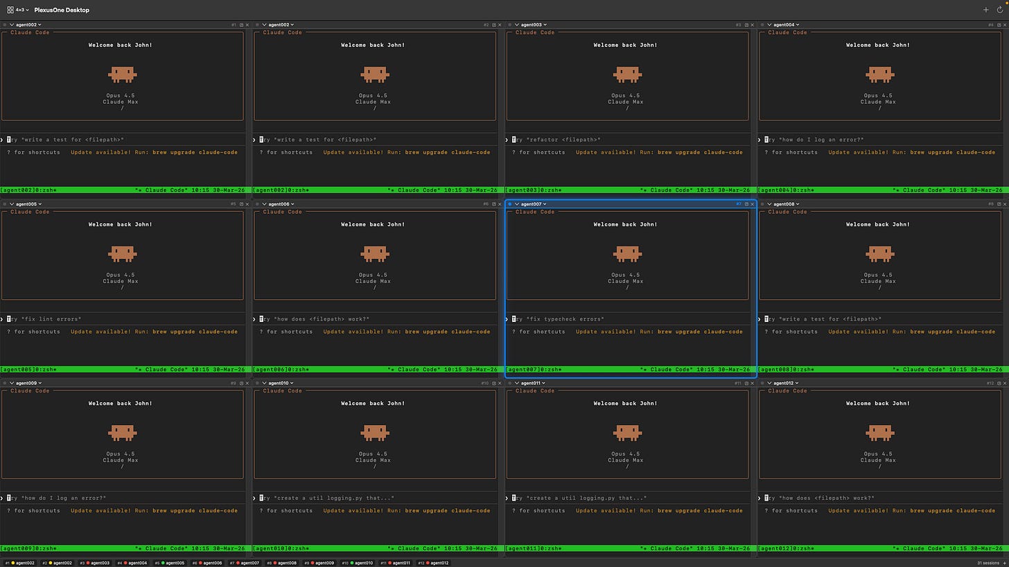 At some time Figure 7 becomes very hard to manage because I found myself clicking around in multiple windows which may not always be visible at the same time. I was doing this with many terminal tabs and several terminal windows before moving to tmux panes and finally deciding to take some time to build my own tiling windows manager, which is now available as the PlexusOne App, a macOS app built in Swift. While this app is still very new and has some quirks, it has quickly become my always on AI agent interface, allowing me to interact with Claude Code, Kiro CLI, Codex CLI, Gemini CLI and others via tmux sessions. I created the following 4x3 diagram for demonstration purposes, but I will typically use 3x2 or 3x1 layouts.